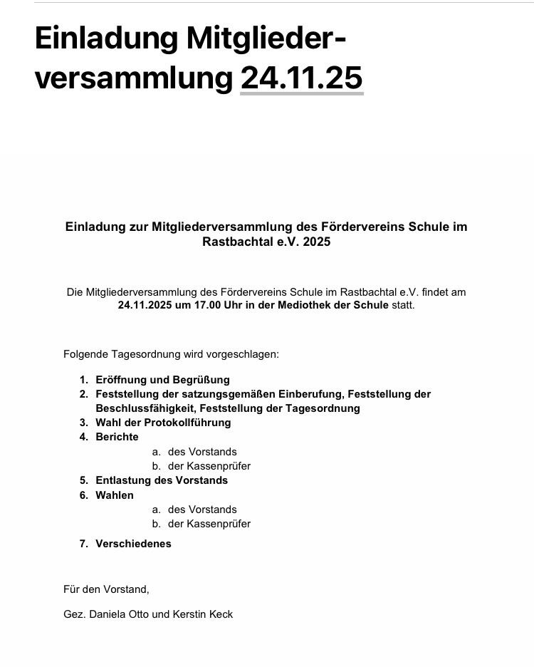 24.11.2025 Mitgliederversammlung des Fördervereins Schule im Rastbachtal e.V. 2025